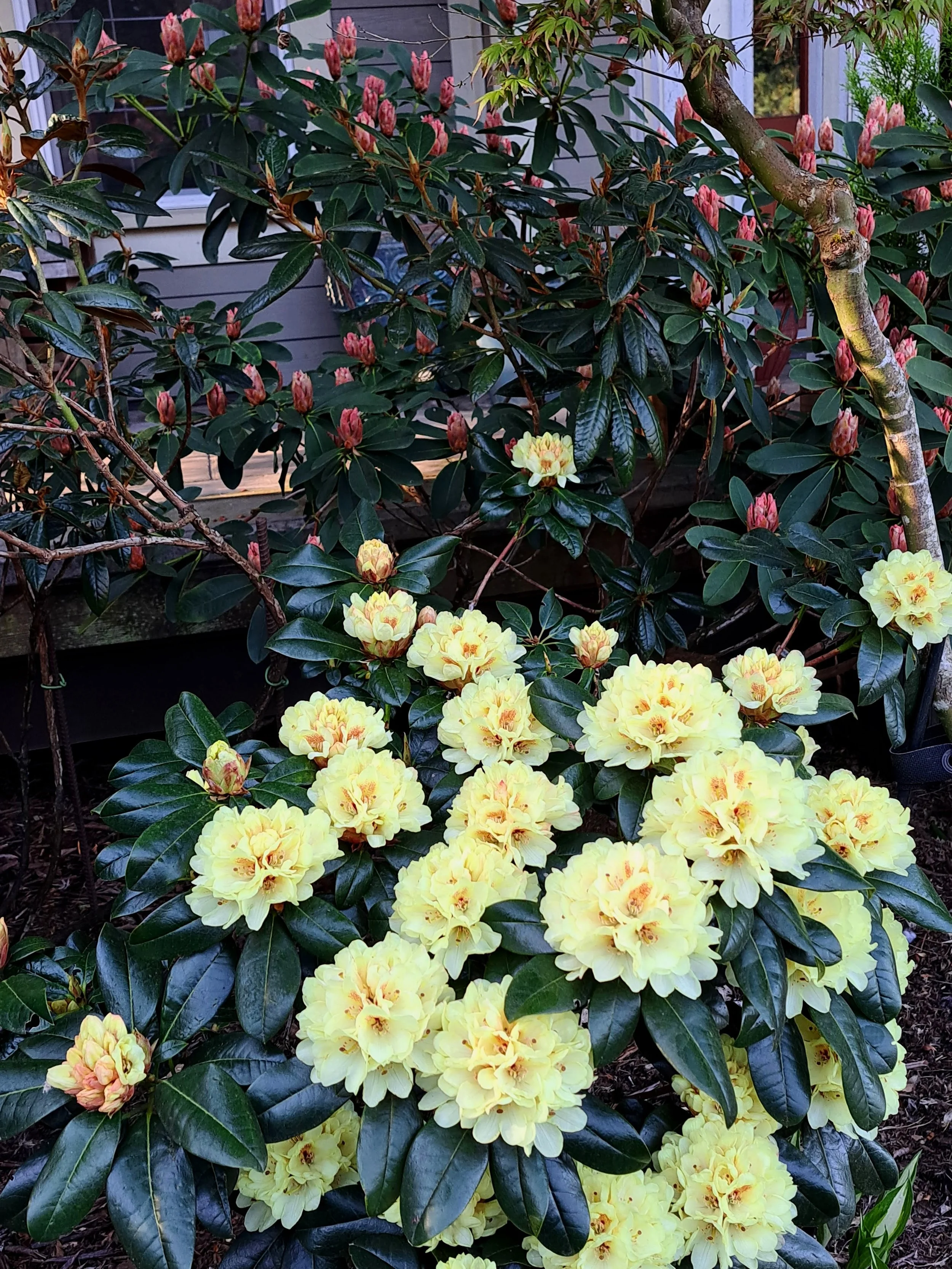 Jim Barlup’s Rhododendron ‘Sun Silk’ and Frank Fujioka’s Rhododendron ‘Starbright Champagne’ in bud behind. These rhododendrons were selected and planted by the home owners as prize features on both sides of the front entrance to their home.