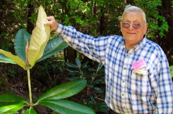Moe Massa, proudly lifts the leaf of a big leaf rhododendron that he had grown from seed.