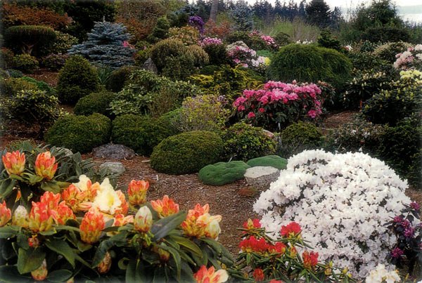 “On the west side of his garden, Frank landscaped with lepidotes, weaving them into a carpet of bloom, strong enough to withstand the harsh, island winds and sun from the west. The vista to the east of the garden integrated Japanese maples, dwarf conifers and sculpted plant materials which provided year-long interest. Frank's artistic eye orchestrated the colours of stems, leaf buds and blossoms to create a symphony of hues whether the garden was in spring bloom or its autumn cloak.”