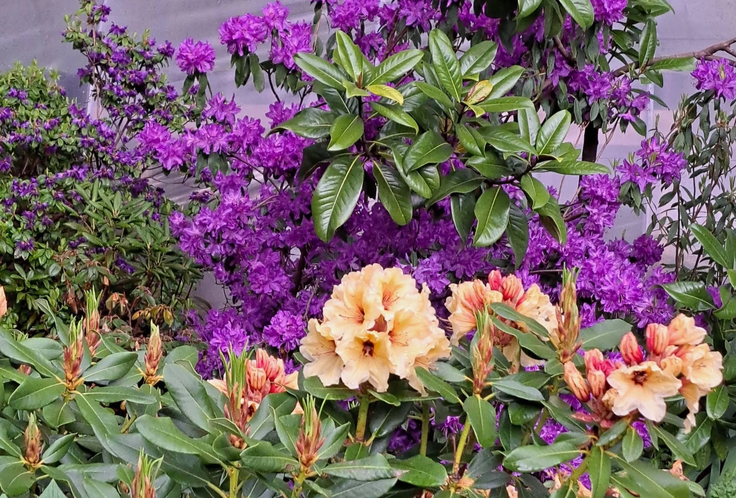 Rhododendron augustinii ‘Marine’ with Rhododendron ‘Horizon Lakeside’ in front
